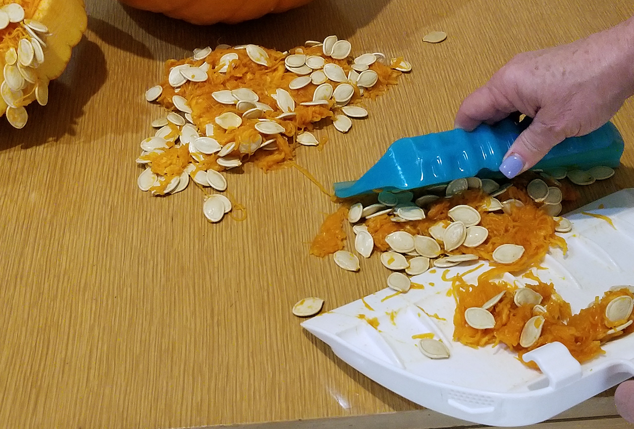 Since Mrs Chuck will roast up some fine pumpkin seeds for snacking, we keep all the gourd goo instead of chucking it right into the composter. With a population of six or seven Jack-O’s this turns into a hefty heap of gizzard. Fortunately for us, we scored one of the new Mini-Gelblade / Collection pan combo’s. Now this clean-up is a cinch.